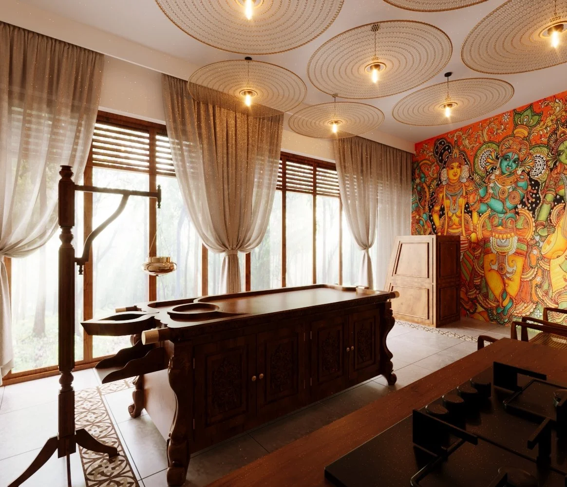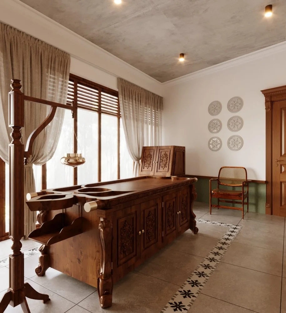 The center is designed to reflect this harmony between modern comfort and cultural authenticity. Bright, spacious rooms welcome natural light, while open verandas and shaded courtyards echo the architectural character of Kerala. Every detail, from the tranquil gardens to the quiet pathways beneath ancient trees, has been created to foster a sense of ease, balance, and connection.